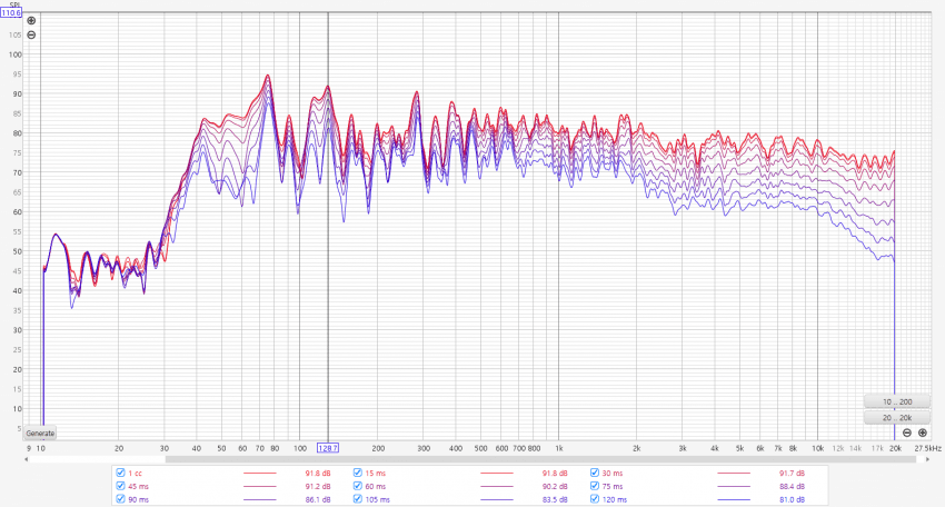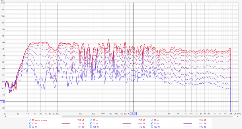 75hz 130Hz 등 400대역까지 딥 피크로 인해서 주파수 응답이 많이 손상되어 있는 것을 볼 수 있습니다.